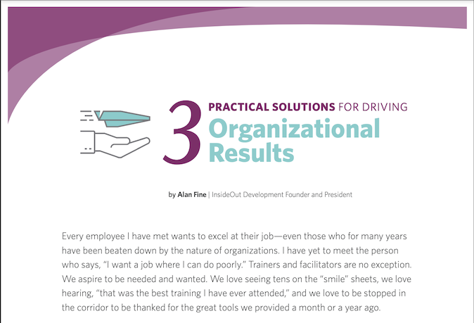 The Three Practical Solutions for Driving Organizational Results Whitepaper gives trainers, facilitators, and leaders simple approaches to increase relevance, reduce interference, and drive stronger performance in their organizations.