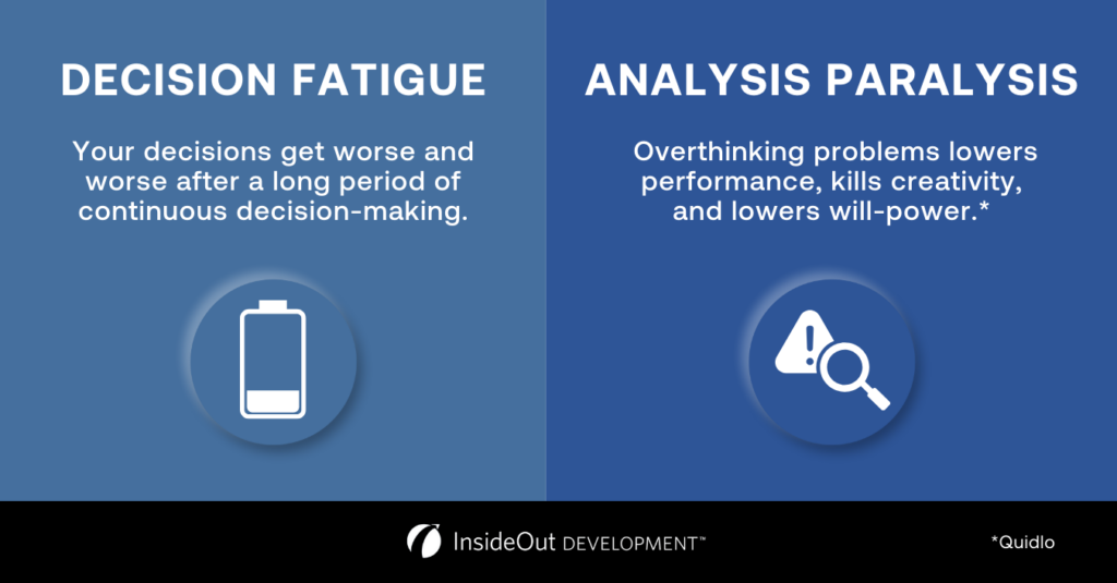 Analysis paralysis occurs when you spend too much time spinning your wheels on the same problem — maybe as a result of decision fatigue.